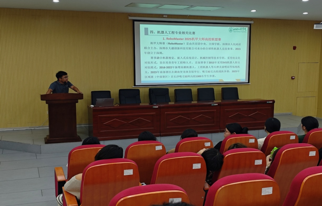 活动的第二环节在学校学术报告厅隆重举行。江西工程学院机器人工程教研室主任郜永生为新兴产业工程学校的师生们带来了一场题为《机器人工程与竞赛创新》的精彩讲座。他深入剖析了机器人工程的专业内涵、行业发展趋势及前沿技术应用,重点解读了全国大学生机器人大赛、中国机器人大赛等权威赛事的竞赛规程与评判标准。通过生动的案例展示,郜主任全面呈现了江西工程学院团队在路径规划算法、机械结构设计等领域的创新成果,特别分享了团队近年来斩获的6项国家级奖项的备赛经验与技术突破,为在场学子提供了极具价值的专业指导。