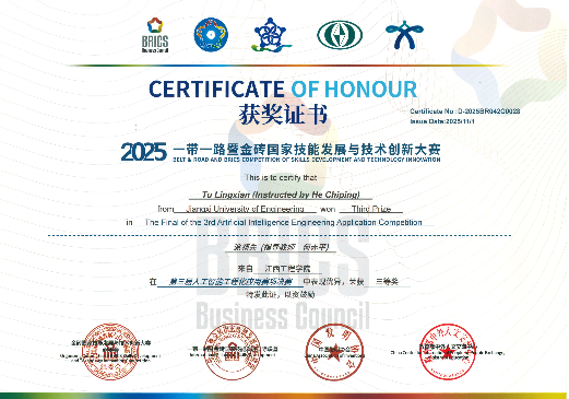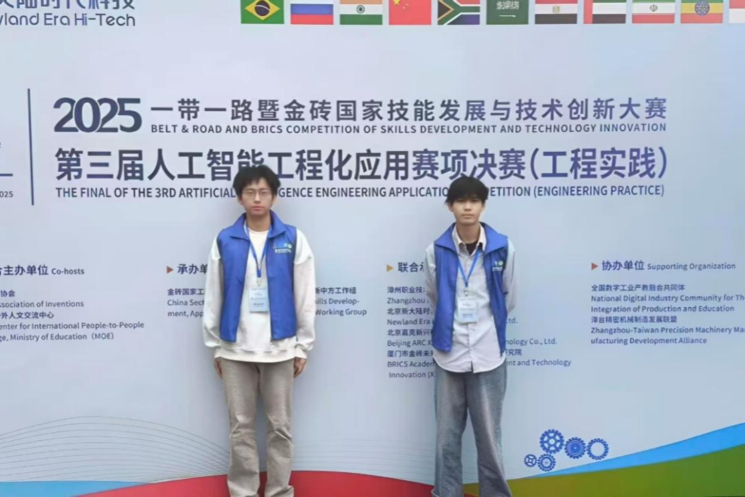近日,2025年“一带一路”暨金砖国家技能发展与技术创新大赛人工智能工程化应用赛项总决赛在漳州职业技术学院举行,经过4小时的激烈角逐,我校人工智能与数据科学学院的涂领先、陈凯两位同学表现优异,首次参加并双双斩获全国三等奖,充分展现了学校在AI工程化人才培养方面的扎实成效。
