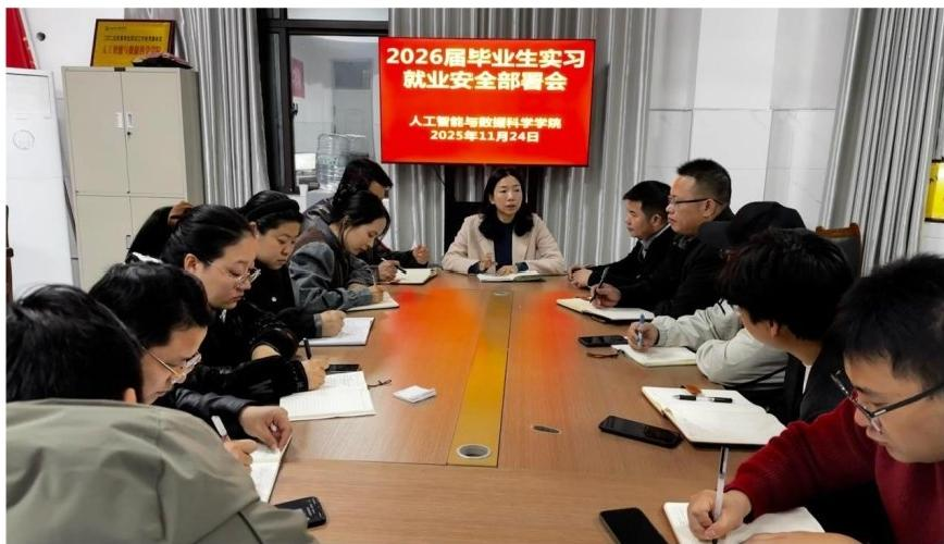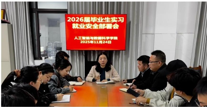 为切实保障毕业生实习就业期间的安全与权益,11月24日,人工智能与数据科学学院在C312会议室召开2026届毕业生实习就业安全部署会。会议由学院党总支书记王娟主持,全体辅导员、班主任参会,会议围绕实习就业全流程的安全管理与服务保障展开详细部署。