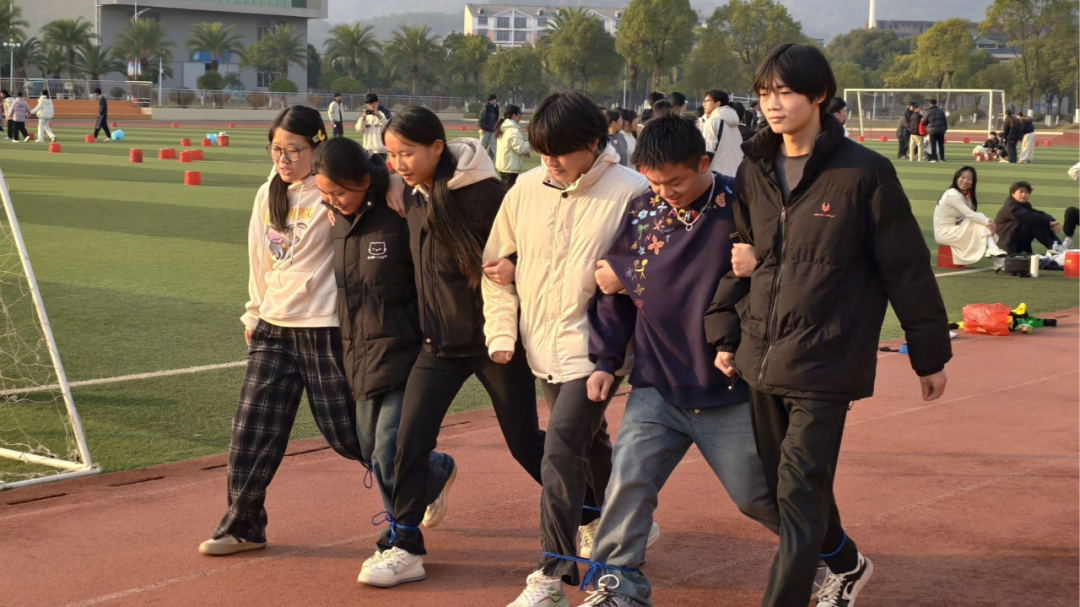 规则:每组选派6名队员,将相邻两人的脚踝用绑带绑紧,形成“六人七足”队形,从起点出发向终点冲刺,用时最短的小组获得最高积分。
