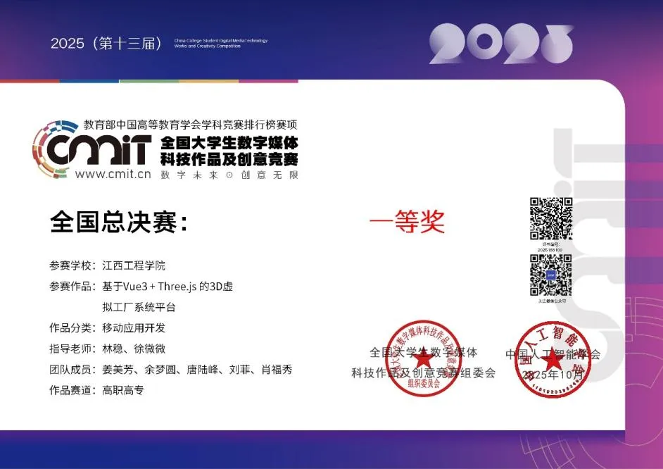 全国大学生数字媒体科技作品及创意竞赛是由中国人工智能学会等主办的全国普通高校大学生A类竞赛,已连续举办十三年。本届大赛高手云集,以“科技引领未来,创意变革时代”为主题,聚焦智能科技与创意设计深度融合,吸引了包括众多“985”“211”“双一流”高校在内的全国上千所院校、数万支团队报名参赛,竞争空前激烈。自九月份参赛以来,学院领导高度重视,指导老师认真负责,从省赛到国赛,师生通力合作,反复打磨作品细节,从精细化场景建模到全流程作品调试,最终在全国舞台上自信展示,赢得了评委的高度认可,彰显了我校在数字科技领域的育人成效。