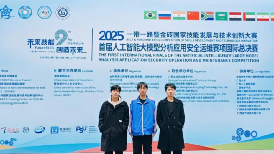 近日,2025年“一带一路”暨金砖国家技能发展与技术创新大赛首届人工智能大模型分析应用安全运维赛项国际总决赛在广西南宁圆满落幕。这场汇聚多个国家和地区顶尖院校的国际顶级赛事,我校人工智能与数据科学学院参赛团队(杨钧、涂领先、陈凯),凭借自主研发的原创大模型,在激烈角逐中脱颖而出,成功斩获国际总决赛二等奖,并荣获优秀组织奖,为学校赢得了荣誉,充分彰显了江工学子在人工智能领域的过硬实力与创新风采!