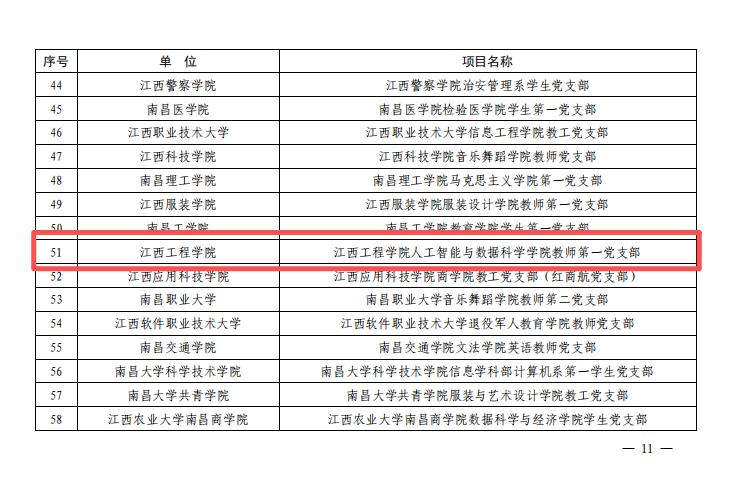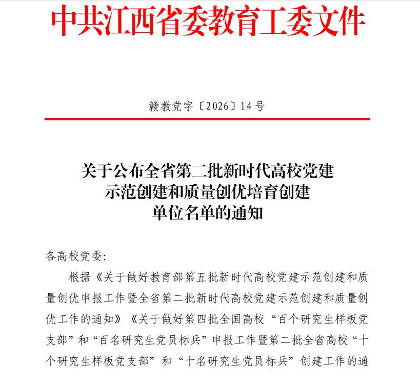 近日,中共江西省委教育工委印发《关于公布全省第二批新时代高校党建示范创建和质量创优培育创建单位名单的通知》(赣教党字〔2026〕14号),遴选产生“全省党建工作标杆院系”50个和“全省党建工作样板支部”102个。江西工程学院人工智能与数据科学学院教师第一党支部成功入选“全省党建工作样板支部”培育创建单位。这是省委教育工委对学校基层党建工作的充分认可,也是学校推进支部党建工作与业务发展深度融合的重要成果。