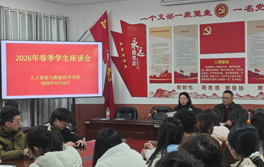 为畅通师生沟通渠道,倾听学子心声、回应发展关切、解决实际问题,助力本科教育工作合格评估提质增效,人工智能与数据科学学院于2026年3月23日在B504会议室召开2026年春季学生座谈会。党总支书记王娟、团总支书记林稳与各班学生代表齐聚一堂,共话校园发展与成长愿景。