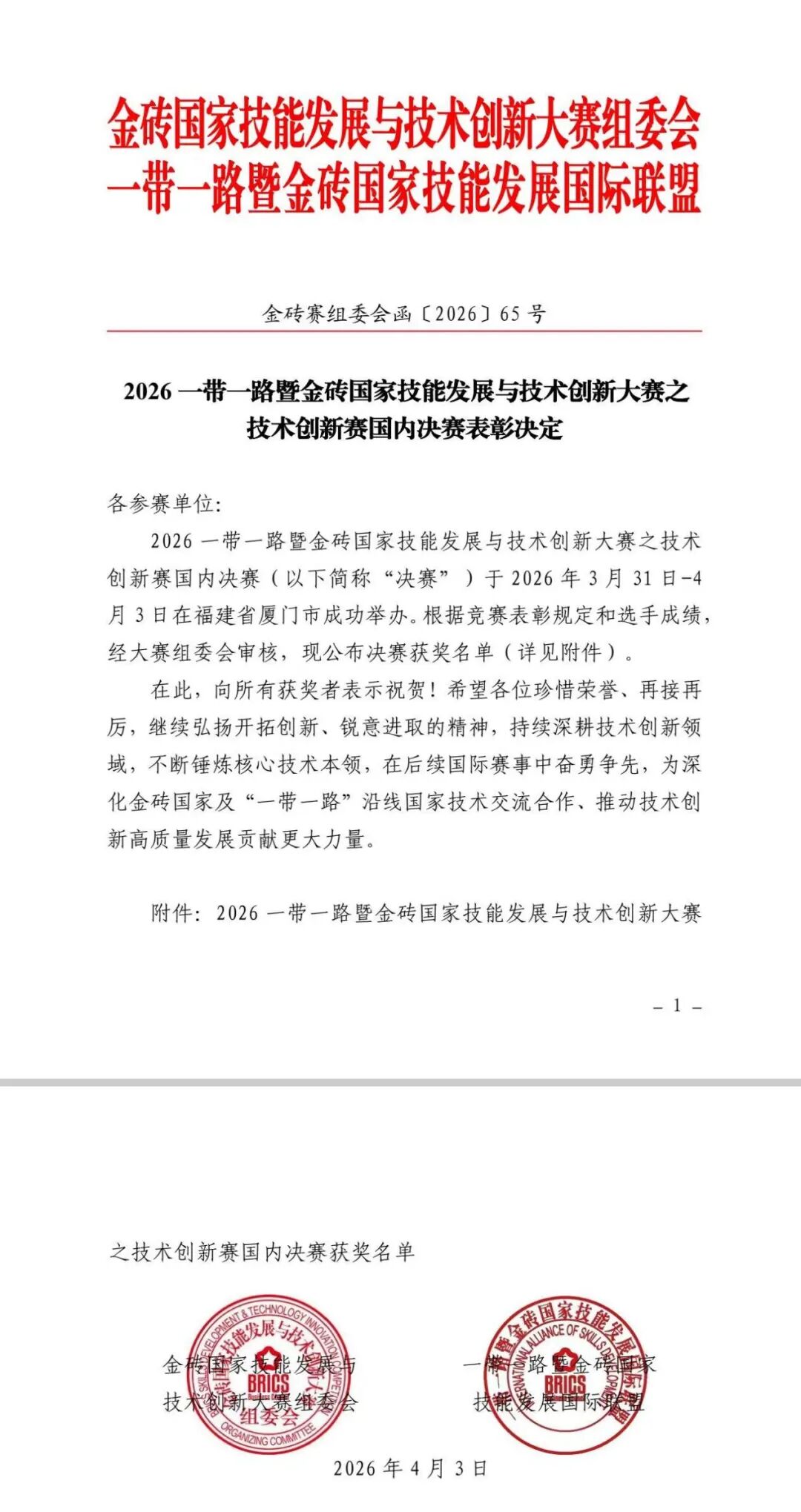 近日,2026年“一带一路”暨金砖国家技能发展与技术创新大赛之技术创新赛国内决赛在福建省厦门市圆满落幕。本次大赛自启动以来,共吸引561家单位报名参赛,涵盖西北工业大学、国防科技大学等国内顶尖高校代表队同台竞技,经过层层遴选,最终由我校人工智能与数据科学学院杨钧、王恒、陈凯、涂领先、胡紫萌五位同学组成的参赛团队,凭借扎实的专业功底、突出的实践创新能力和默契的团队协作,在众多强手中脱颖而出,成功斩获全国三等奖。