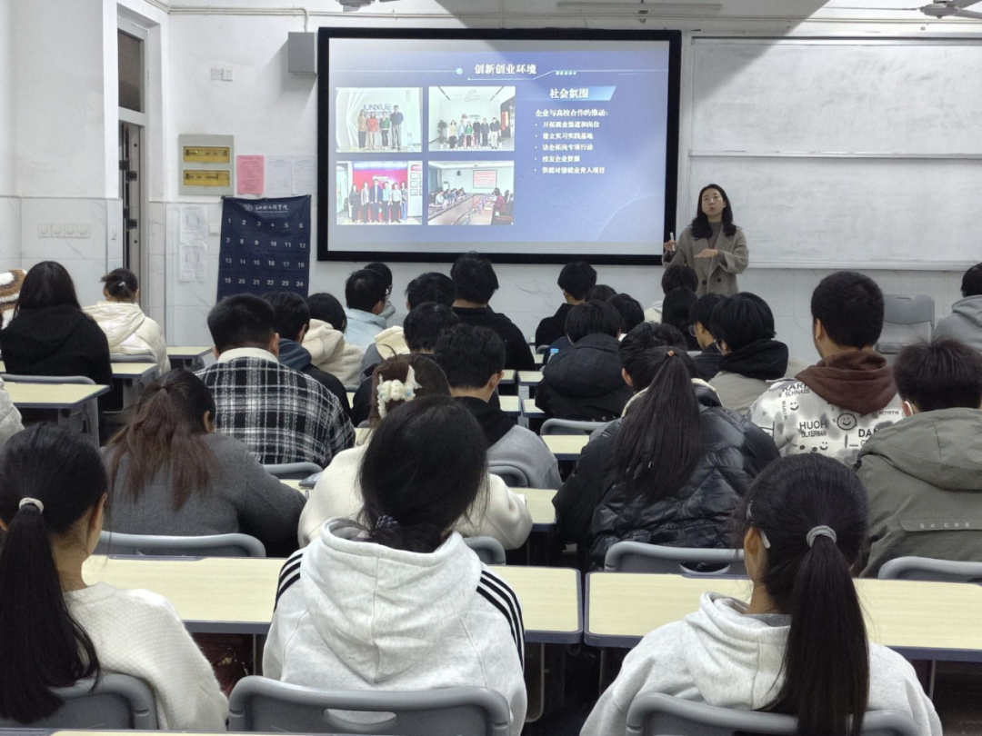 讲座中,王娟首先从国家创新驱动发展战略的高度,阐释了大学生创新创业的时代价值,强调这既是推动经济发展的重要力量,也是提升自身能力的关键路径。随后,她解读了双创的多重支持环境——政策上有财税扶持、金融支持与风险救助等利好,社会层面则有校企合作、实习基地搭建等助力;同时结合详细的数据,分析了当前高校毕业生就业的压力与机遇,并对重点群体就业支持、灵活就业等未来方向给出了清晰展望,为学子们的职业规划提供了关键参考。