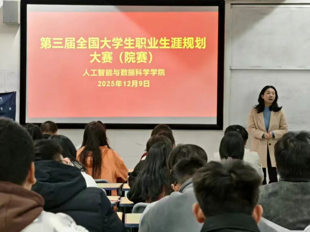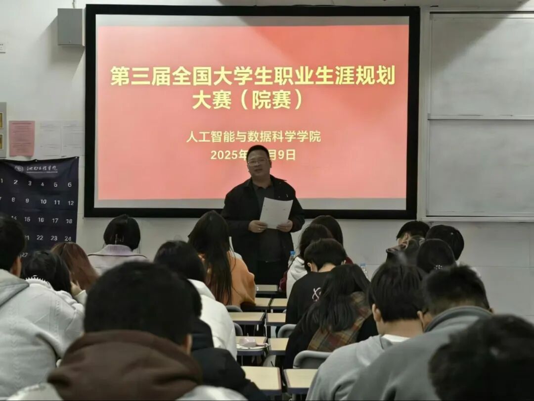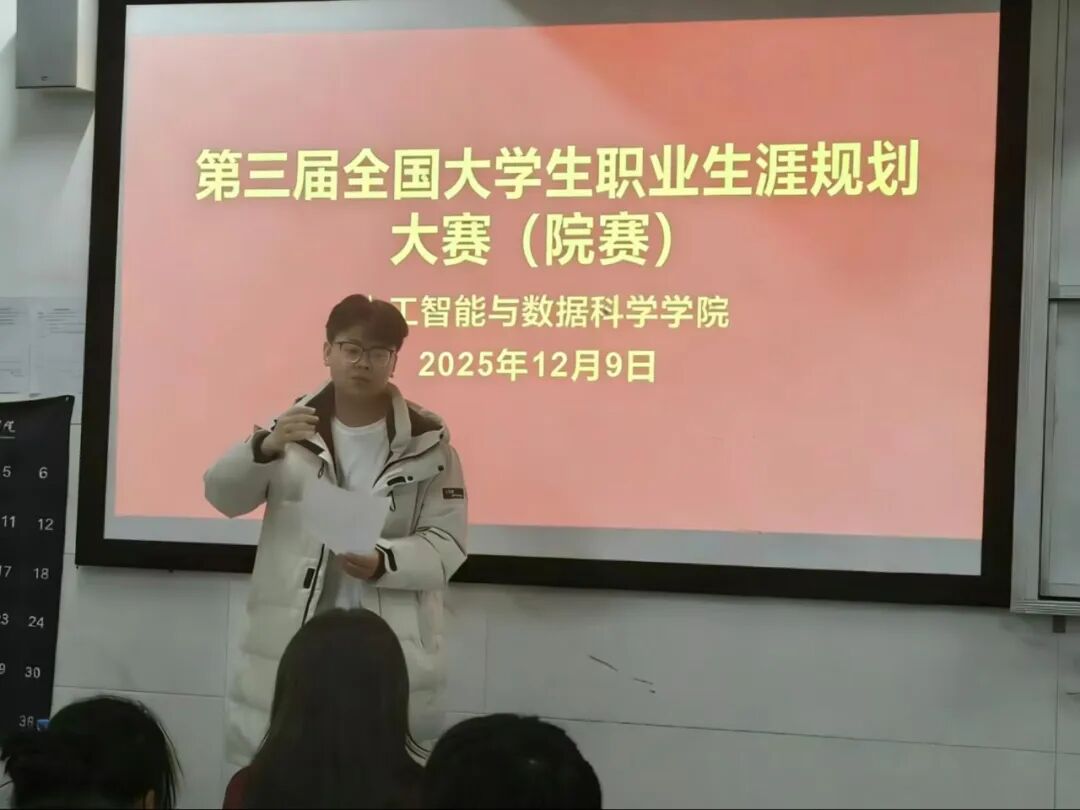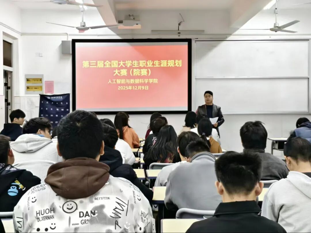 为引导学生树立正确的成才观、就业观,科学地规划职业生涯,提升就业竞争力,12月9日,人工智能与数据科学学院于C306成功举办2025年大学生职业生涯规划大赛。本次大赛有学院党总支书记王娟等领导出席,由党总支副书记郑智山主持,学院辅导员及学生参加。