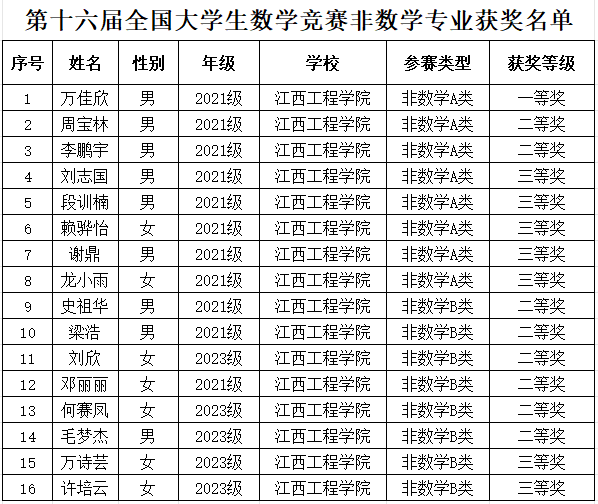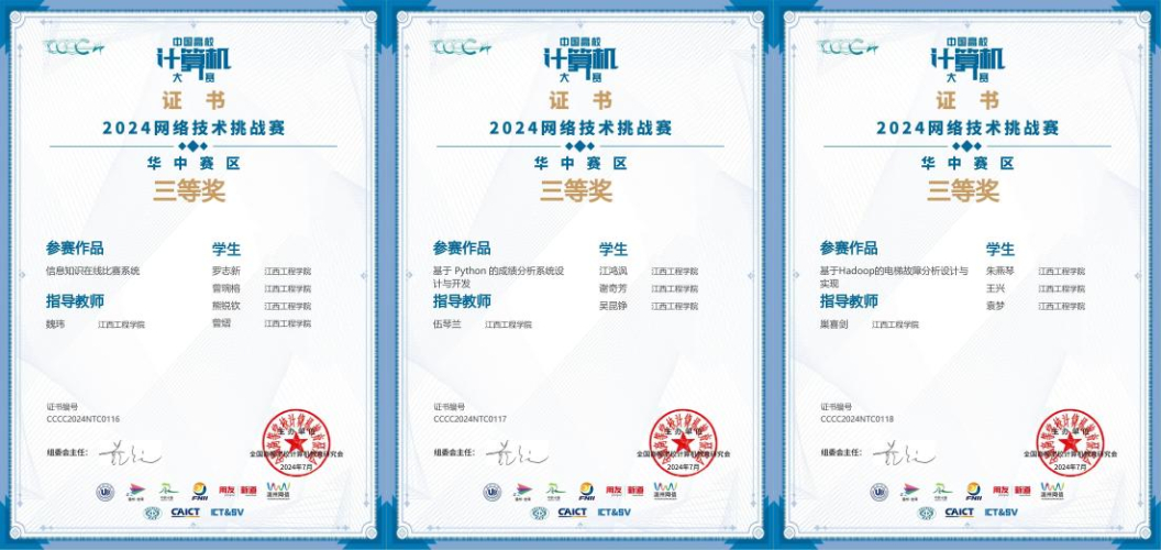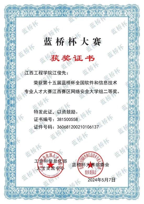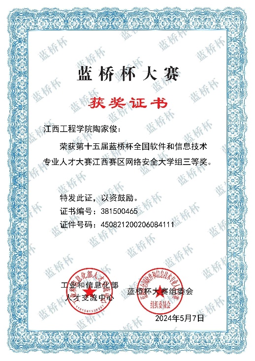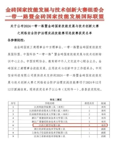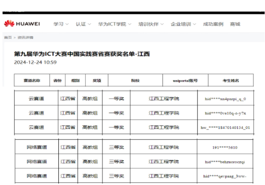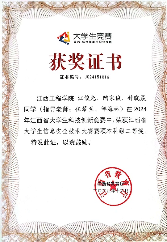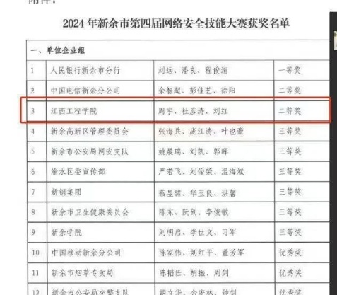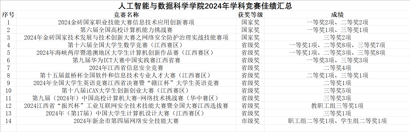 2024年学院学生在各类竞赛中屡获佳绩,包括2024年江西省华为ict大赛一等奖3项、三等奖3项、第十六届全国大学生数学竞赛江西省赛一等奖1项二等奖8项三等奖7项、江西省振兴杯教职工组三等奖,新余市网络安全大赛二等奖、2024年江西省信息安全竞赛二等奖4项、2024年金砖国家技术发展与技术创新大赛之网络安全防护治理实战技能赛项三等奖2项、2024年蓝桥杯网络安全二等奖、2024中国高校计算机大赛网络技术挑战赛华中区三等奖、2024金砖国家信创赛一等奖2项、二等奖2项、第十八届iCAN大学创新创业大赛(江西赛区)三等奖5项、2024年海峡两岸暨港澳地区大学生计算机创新作品赛江西赛区(一等奖1项、二等奖3项、三等奖8项)、2024年江西省“赣江杯”大学生英语竞赛二等奖、2024年江西省大学生计算机设计大赛三等奖、2024年新余市第四届网络安全技能大赛 职工组二等奖、学生组二等奖、第六届全国高校计算机能力挑战赛,全国一等奖1项、三等奖1项,这些竞赛成绩充分展示了学院学生的专业素养和实践能力。【具体统计见下表】