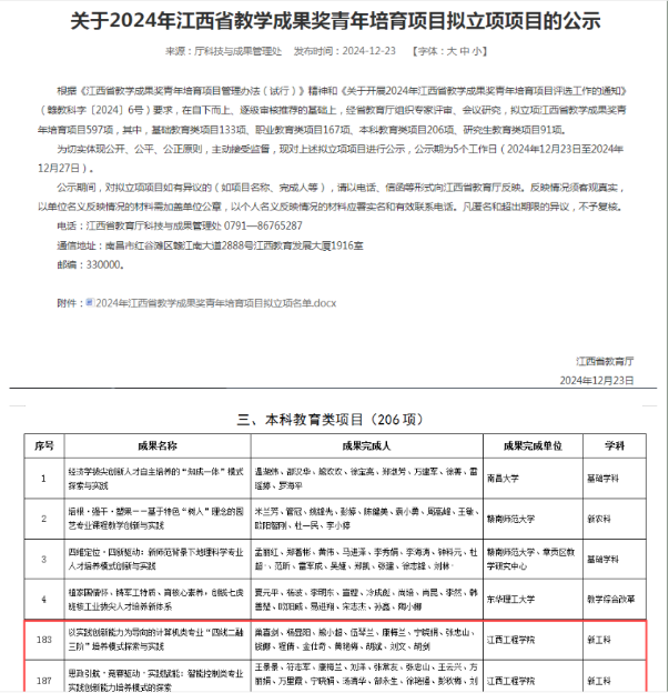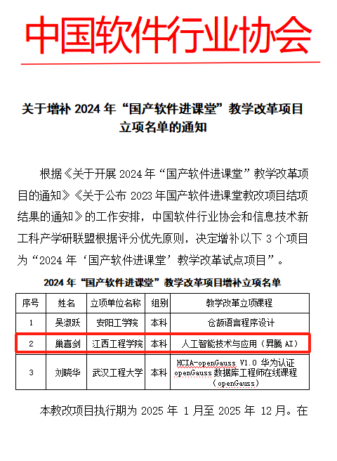 2024年,学院在教学质量工程建设方面取得显著成效,获批工信部首批工业信息安全人才培养实施单位和工信部第五批“麒麟工坊”实训基地,获得江西省教学成果奖青年培育项目《以实践创新能力为导向的计算机类专业“四线二融三阶”培养模式探索与实践》、江西省首批校企合作一流本科课程《Linux操作系统》,江西省十四五规划教材1部,江西省教学改革项目立项(全校2个),以及江西省教育厅科学技术项目多项,教育部协同育人项目1个(面向新工科建设的网络安全师资培训项目)。特别是人工智能技术与应用(昇腾AI)课程入选2024年“国产软件进课堂”教学改革项目,彰显了学院在前沿技术教学方面的实力和创新精神。