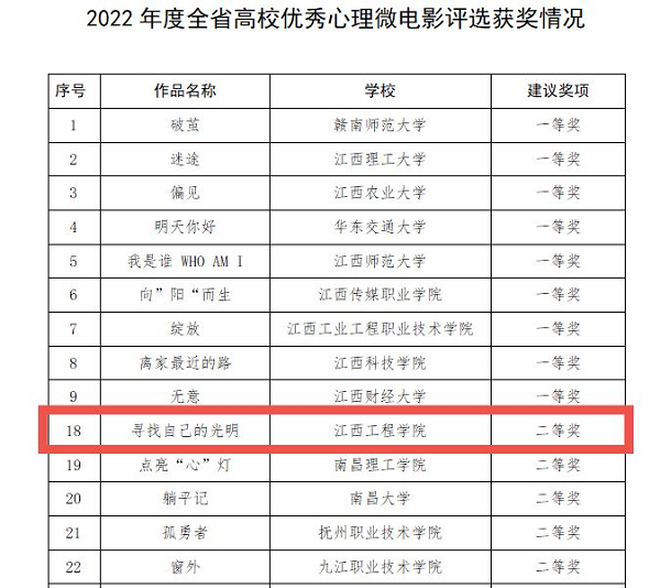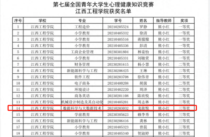 学院注重实践育人和学生的全面发展,通过参加校运会、篮球赛(冠军)、育人故事分享会(二等奖)、525心理系列活动(二等奖)、红色故事分享会(二等奖)、职业规划赛(三等奖)、学生公寓文化节(一等奖)等第二课堂活动,丰富了学生的校园文化生活,提升了学生的综合素质。另外,学院还荣获2022年度江西省高校优秀心理微电影二等奖、2023年江西省受助学生成长成才典型事迹三等奖和江西省大中小劳动教育标语口号征集评选二等奖(董海清同学作品《汗水点燃劳动之光,知识驱动未来之路》荣获二等奖,张子扬同学作品《劳动——最美丽的奉献》荣获三等奖)、2024年全国青年大学生心理健康知识竞赛三等奖(龙歆悦)和江西省大中专学生志愿者暑期“三下乡”社会实践活动优秀个人(吴丽娜)及共青团新余市委优秀讲师(林稳)等一项项的优异成绩,体现了学院对实践育人的高度重视和有效实施。